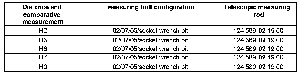 The configuration of the measuring bolts is shown in the table, where the digits in the column headed "Measuring bolt configuration" are the special tool end numbers.