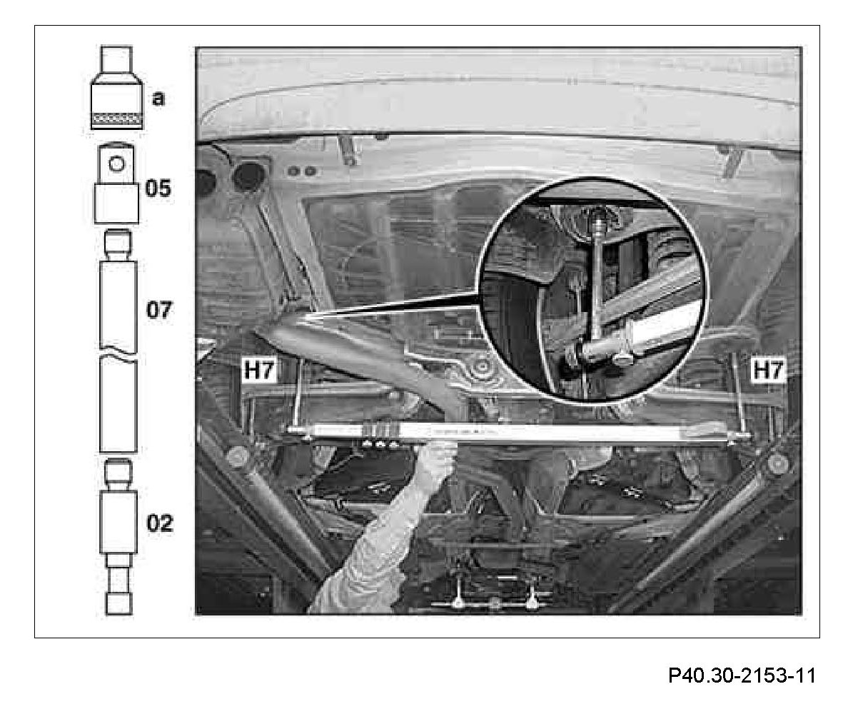 4 Measure distance dimension (H7) from the centering point of the Torx bolt heads between the rear bearings of the rear axle carrier.