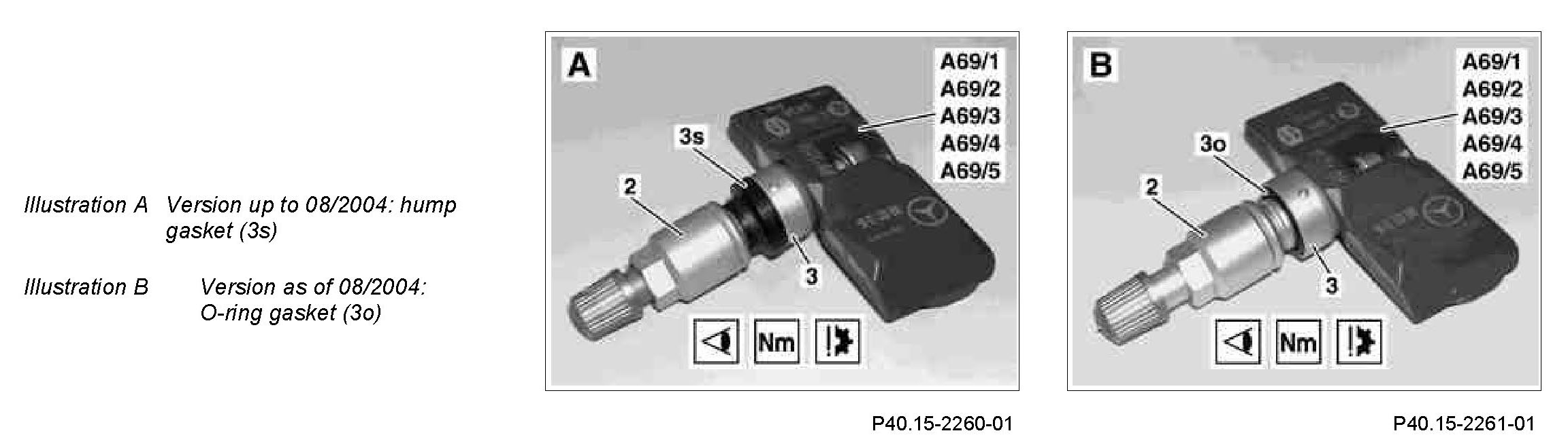 The gasket on the valve body (3) of the TPM wheel sensor (A69/1 to A69/5) has been modified. As of 08/2004 an O-ring (3o) replaces the hump gasket (3s).