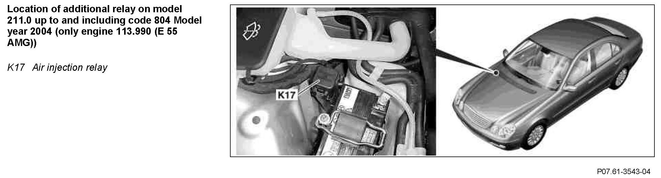 The air injection relay (K17) is located in the engine compartment on the rear right under the dust filter housing or combination filter housing.
