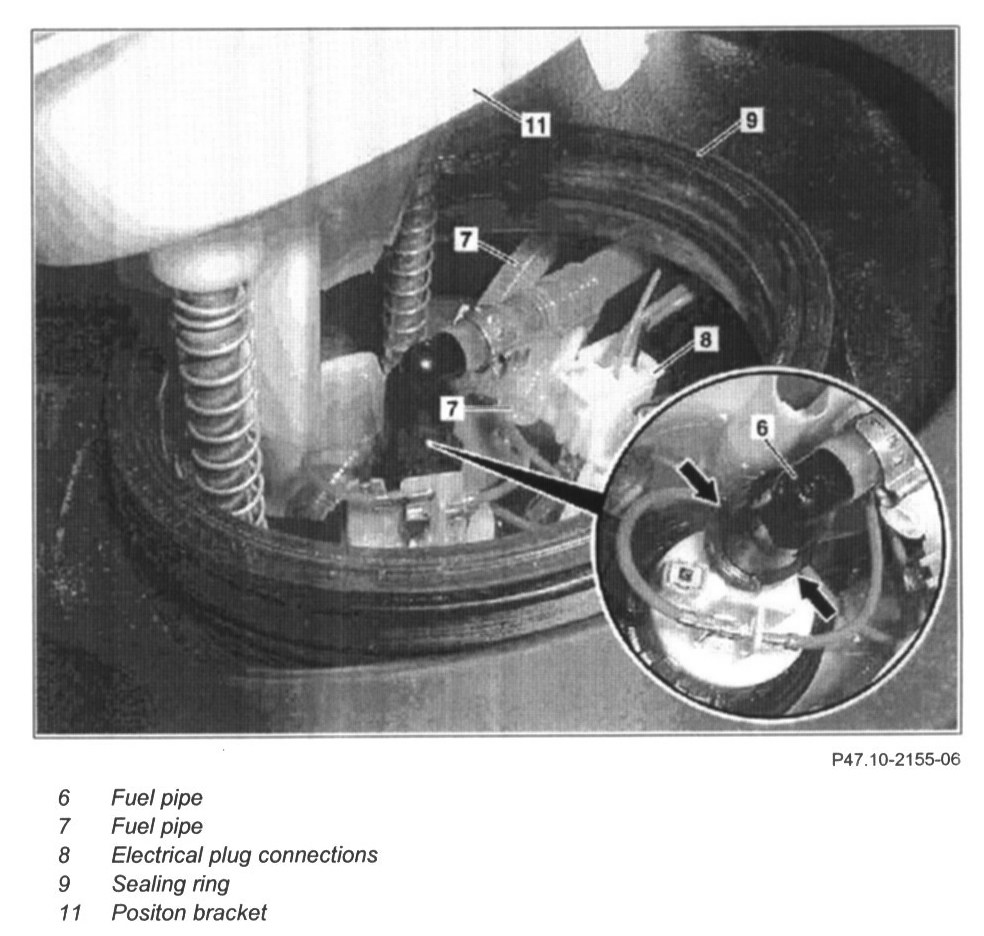 13 Take fuel lines (7) out of brackets at fuel pump (M3)