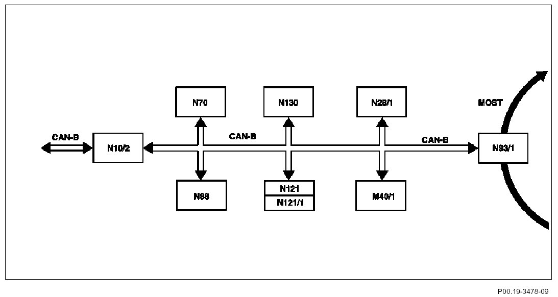 The radio or the COMAND operating, display and control unit forms the interface (gateway) for data exchange between the MOST and CAN-B. The central gateway control unit (N93) is the interface for data interchange between the CAN B bus and CAN C bus. At the same time, it is the interface via CAN-D to the data link connector X11/4), in order to test the control units connected to the different bus systems using STAR DIAGNOSIS.