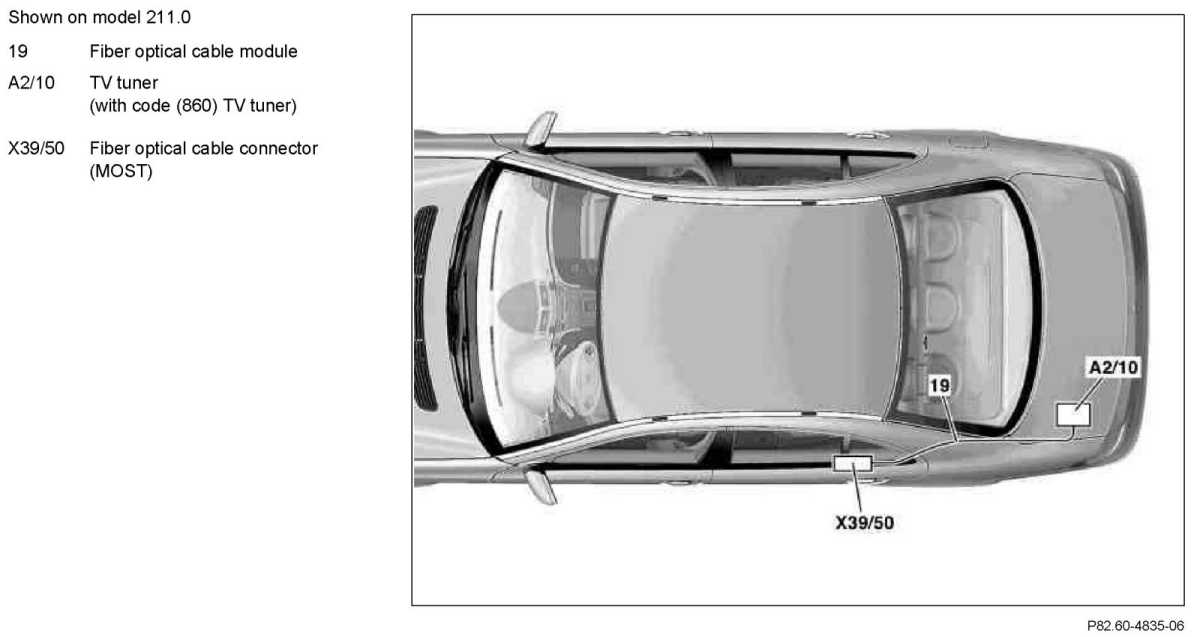 - Fiber optic cable (MOST) between TV tuner and fiber optical cable connector (MOST)