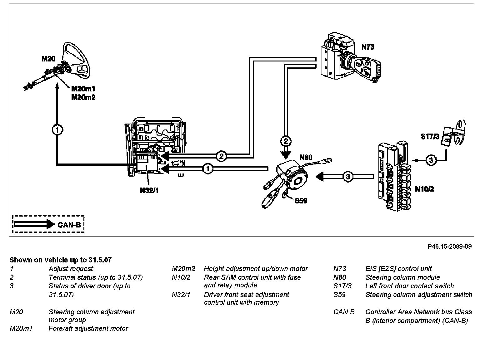 The steering column can be adjusted using the steering column adjustment switch (S59). The corresponding adjustment requests are transmitted via the Controller Area Network-Bus Class B (interior) (CAN-B). The driver-side front seat adjustment control unit with memory (N32/1) actuates the steering column adjustment motor group (M20) accordingly.