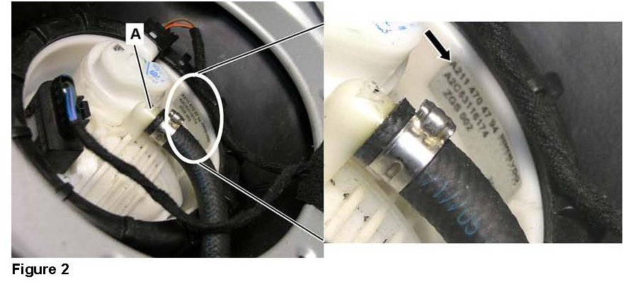 ^ If part number A 211 470 49 94 or A 211 470 51 94 is indicated on fuel filter module assembly (arrow, Figure 2), proceed to subject D.