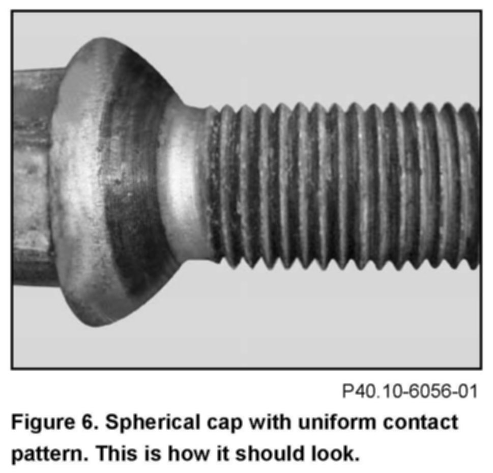 3. Check radius seats of wheel bolt for signs of damage, scoring marks and material deposits. Replace any wheel bolts that are damaged, scored, or have material deposits. Any remaining sizing marks or material deposits will prevent reaching specific torque value.