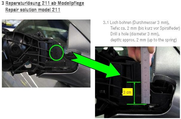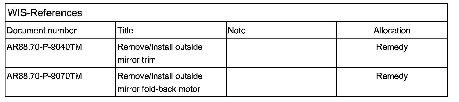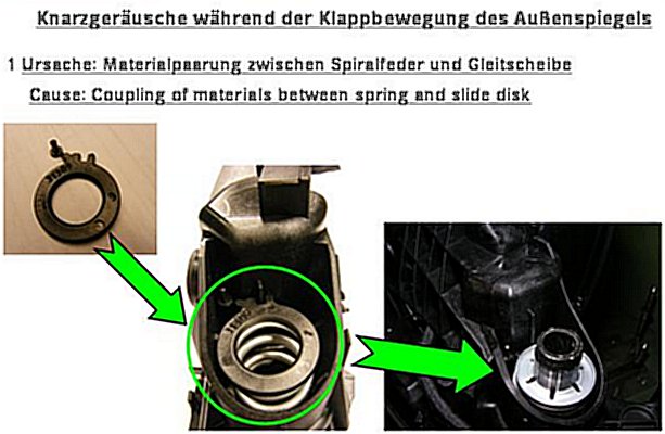 Replace problem mirror (frame parts kit) with mirror with noise-optimized folding drive (see Parts) (see WIS references):-