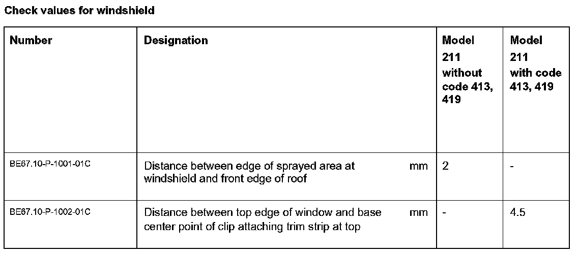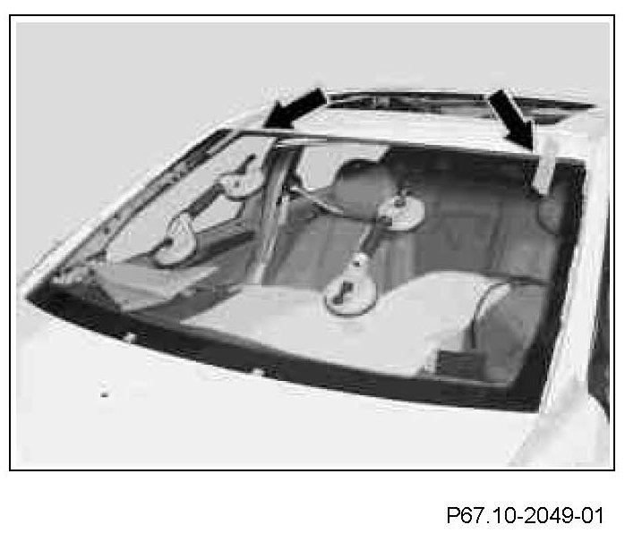 On vehicles without code (413) Panoramic sliding roof or without code (419) Solar module for panoramic roof, completely move windshield (1) with rubber lip to front edge of roof, center at side and fix in place with adhesive strips (distance results from rubber lip).