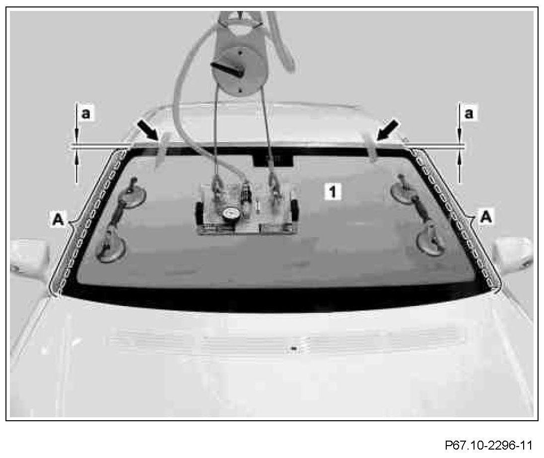 Aid of helper is required for positioning, aligning and prying out the windshield (1). Position suction lifting device in upper third of windshield (1). The windshield (1) must be installed at an acute angle to the A-pillars, otherwise the installation operation is unnecessarily difficult and the windshield (1) can hit against the body flange and be damaged
