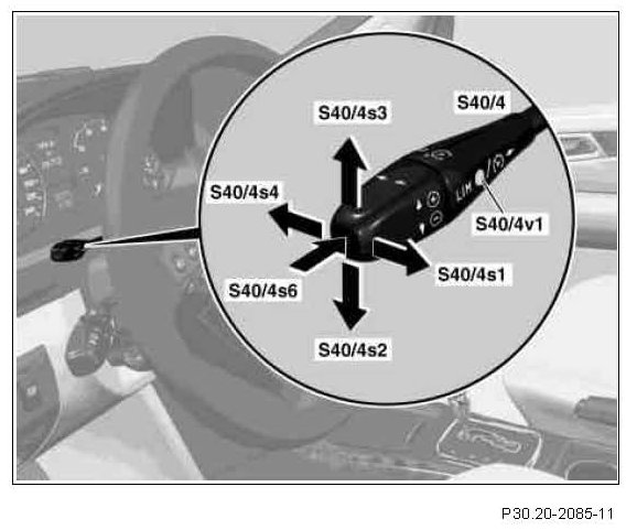 When the cruise control pushbutton switch is operated, two switching contacts are always activated simultaneously. The actual input takes place by closing the switching contacts (storing the speed). The safety contact must close simultaneously so that the input is accepted.