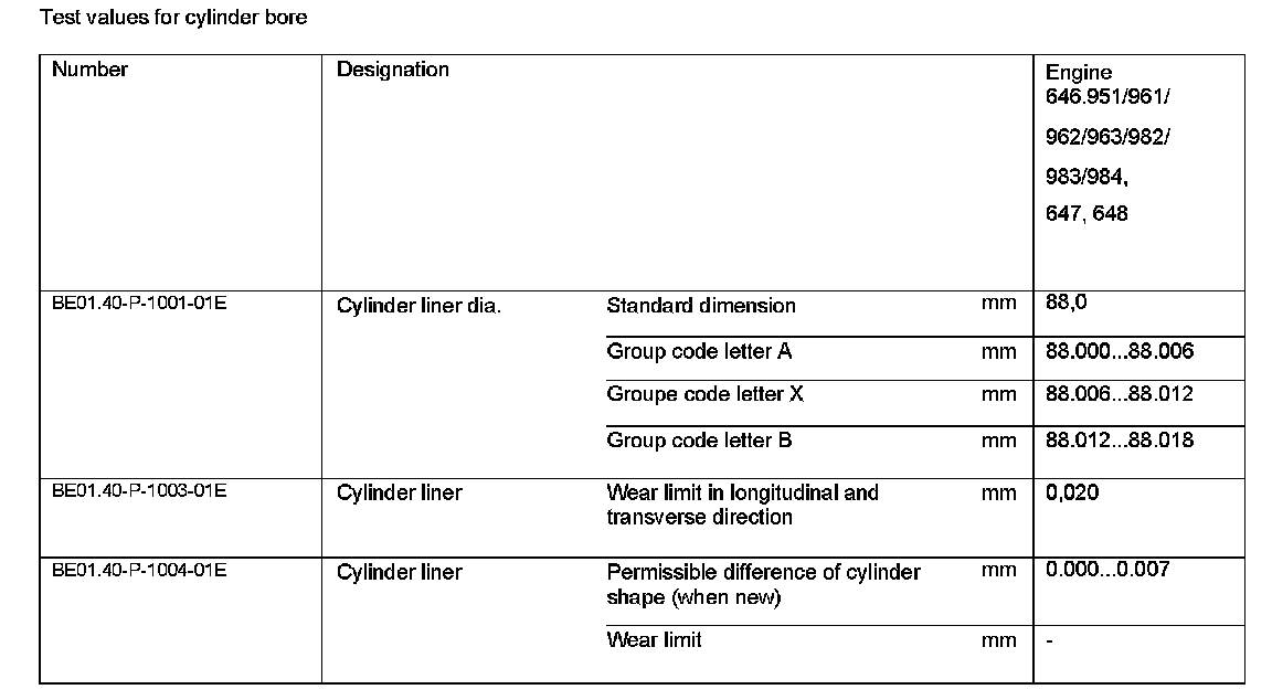 Test Values For Cylinder Bore: