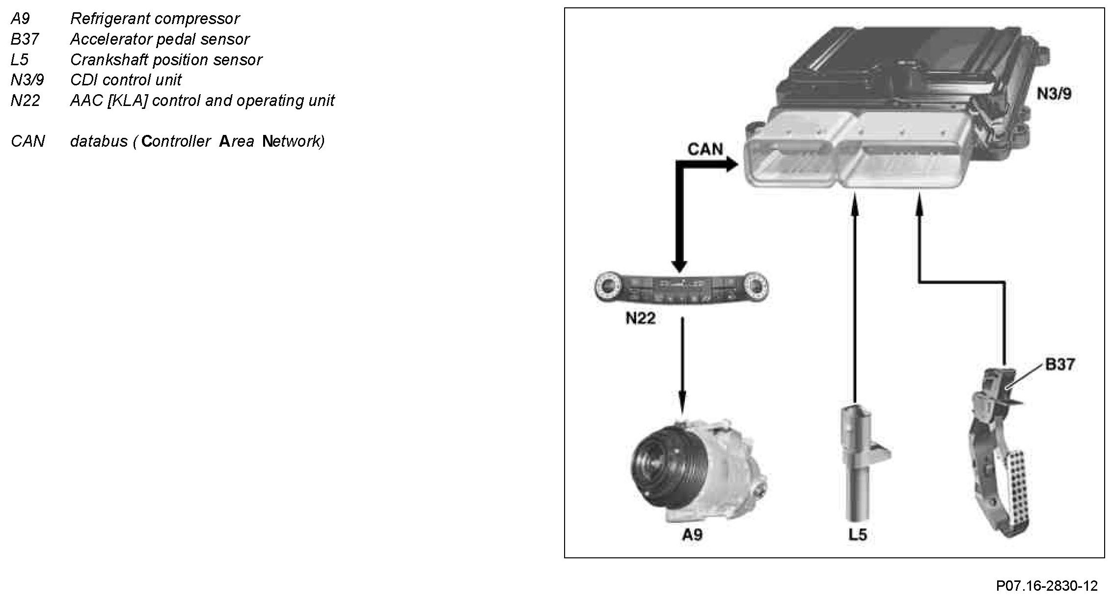 For this purpose, the CDI control unit sends a signal to reduce the torque via the CAN databus to the AAC control and operating unit. The AAC control and operating unit reduces the output of the coolant compressor accordingly, until the coolant compressor is switched off. Once the conditions for torque reduction have expired, the coolant compressor is switched back on.