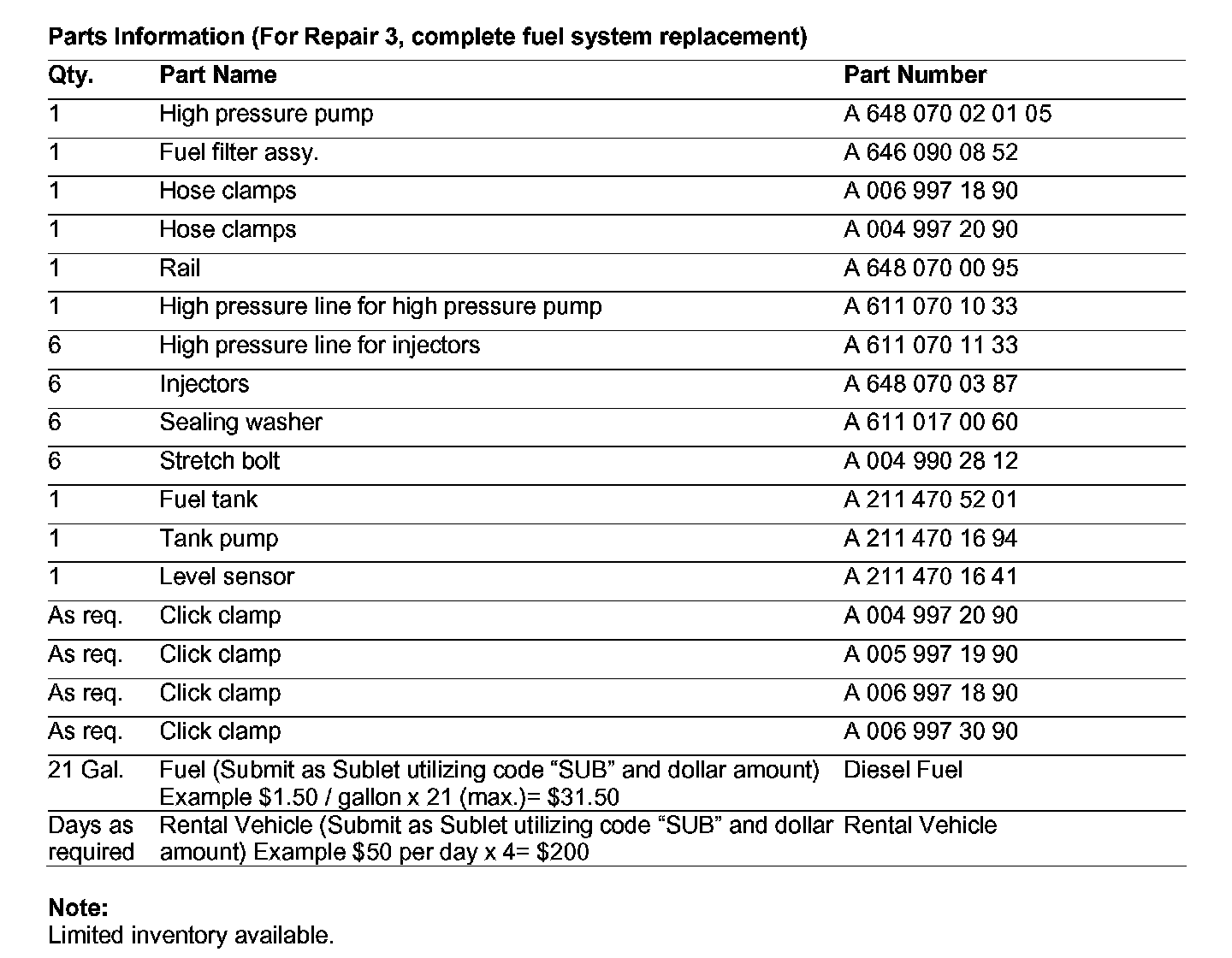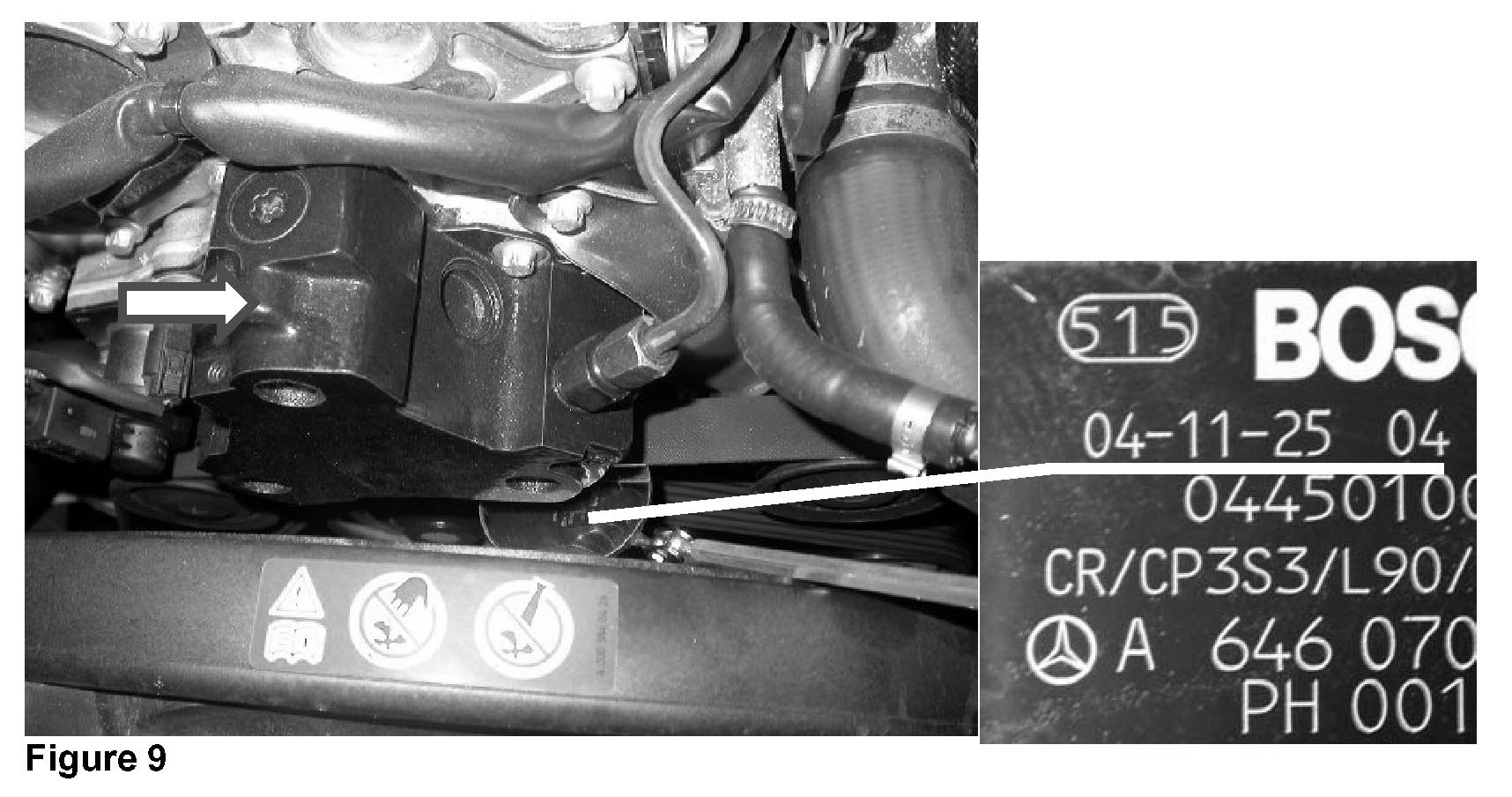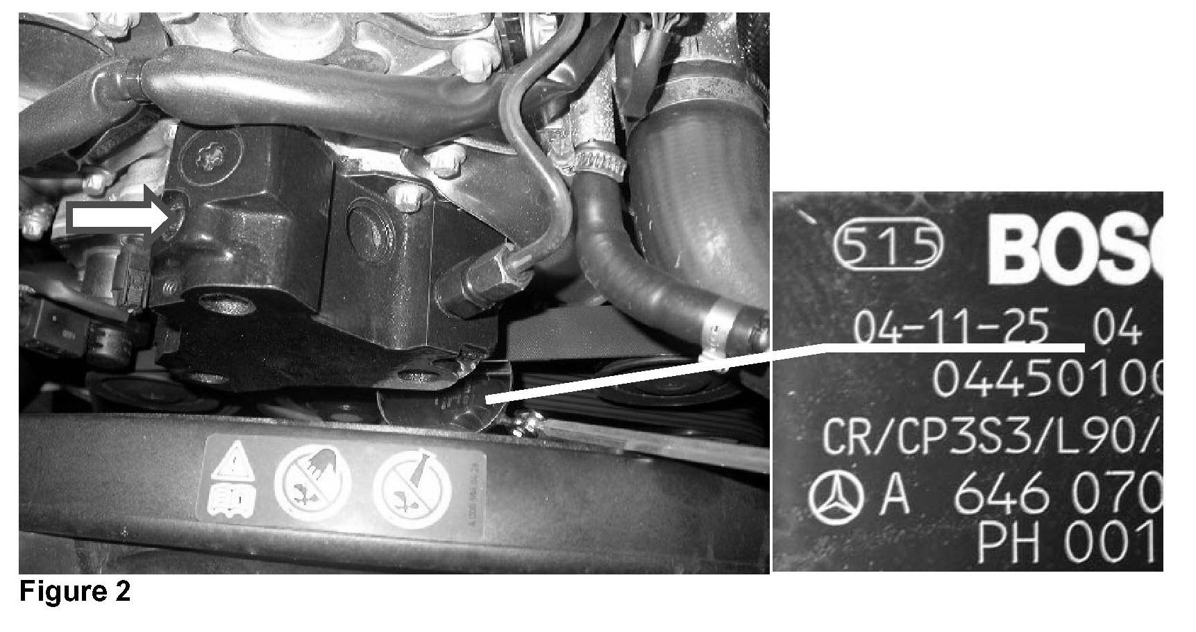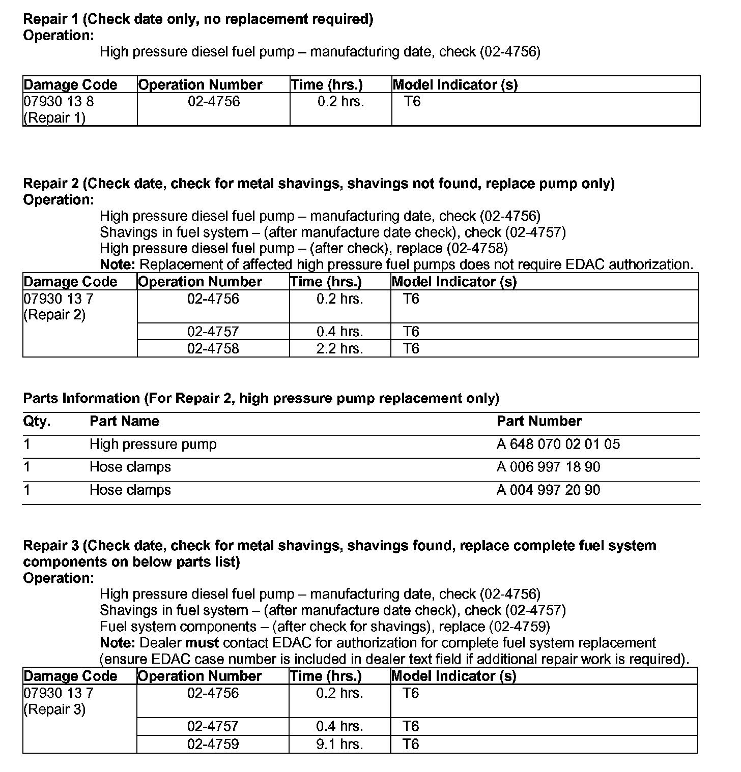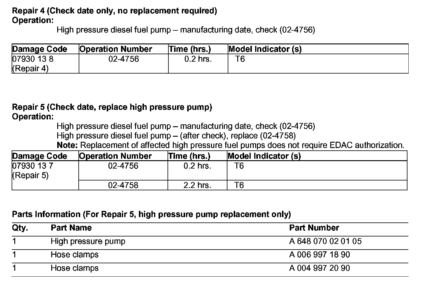 This Service Campaign has been initiated because DCAG has determined that due to a supplier quality issue the high pressure diesel pump must be changed on affected vehicles (refer to VIN ranges below). An unfavorable material composition in the pump bearings may lead to a higher wear and tear condition leading to possible damage of the high pressure diesel pump. To eliminate the possibility of damage to the high pressure diesel pump we have decided to replace this part as a preventive measure on all affected vehicles. Diesel high pressure pumps in vehicles that have already been delivered to the customers will be replaced through this service campaign. Further inspection will be conducted on customer vehicles for metal particles in the fuel. Should metal particles be found, a more substantial repair to fuel system components is required and detailed in the below work instructions. Vehicles that have been held in dealer inventory only require the high pressure diesel pump to be replaced prior to customer delivery.