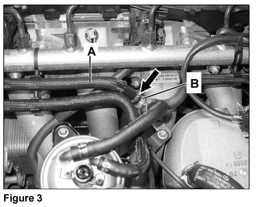 ^ Remove clamp (arrow, Figure 3) from high pressure fuel pump return line (A)