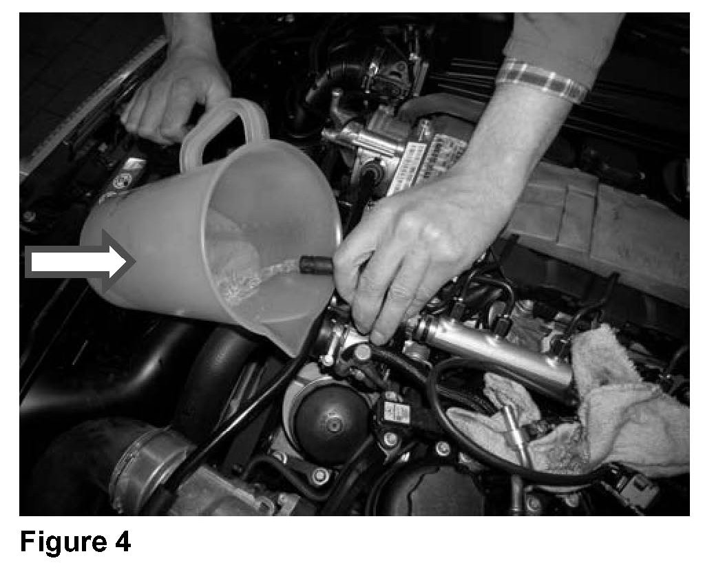 ^ Collect fuel into suitable container (Arrow, Figure 4), making sure to hold on tight to fuel line as fuel is under pressure.