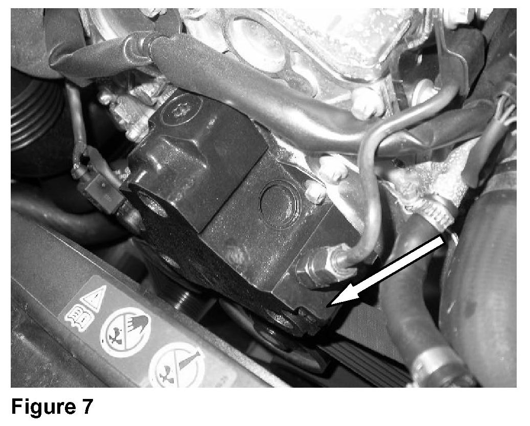 If there is no white dot on new high pressure pump, mark the pump with white color dot, marker or paint pen in front of the threaded sleeve (arrow, Figure 7) of the high pressure line.