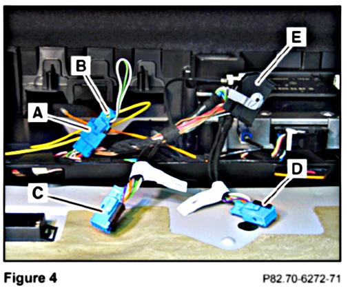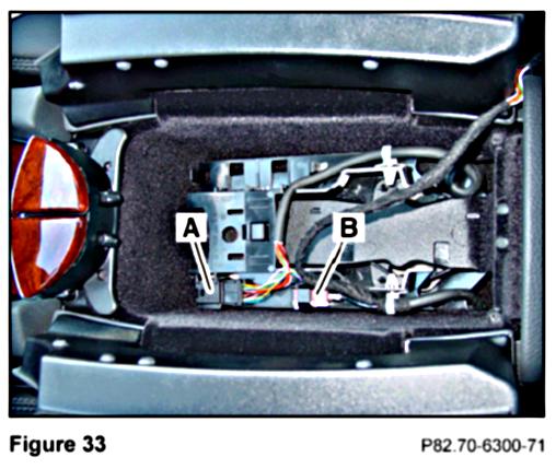 9. Connect the FAKRA antenna male connector from the contact plate to the FAKRA female connector from the console harness (B, Figure 34).