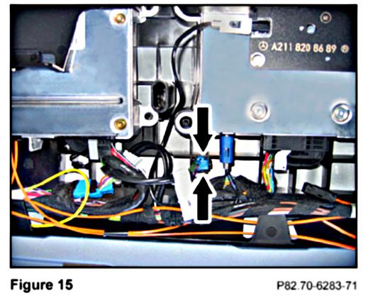 8. Insert the unused MHI microphone connector (Figure 15) labeled "UHI" into the embedded holder on the floor of the carrier plate, front and right of the MHI control module.