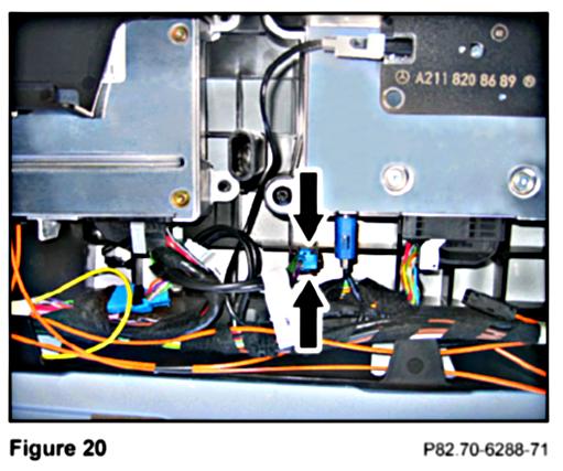 6. Insert the unused VCS microphone connector (Figure 20) labeled with "SDS" into the embedded holder on the floor of the carrier plate, front and right of the MHI control module.