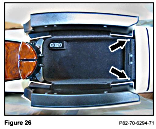 1. Open the upper compartment of the center console and remove the two T8 Torx screws (Figure 26) securing the rear of the false floor.