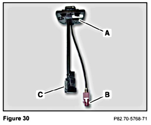 4. Find the kit-included contact plate (A, Figure 30) and identify the FAKRA antenna male connector (B, Figure 30) and the power supply male connector (C, Figure 30).