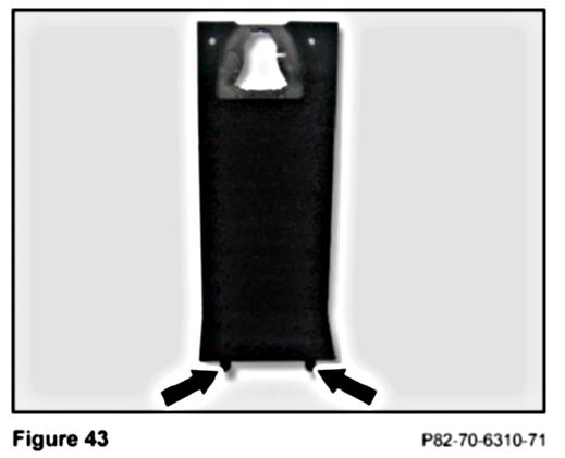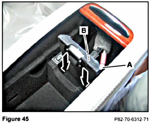 14. Insert the tabs at the bottom of the false floor (Arrows, Figure 43) into the two cavities (Arrows, Figure 45) in the floor, rear of the partition in the center console compartment.