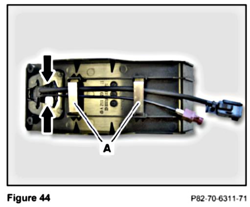 8. Reconnect the Tele Aid/Roadside Assistance button assembly and reinstall the assembly exposing the power supply and FAKRA connectors through the cutout (Figure 42).