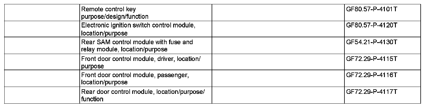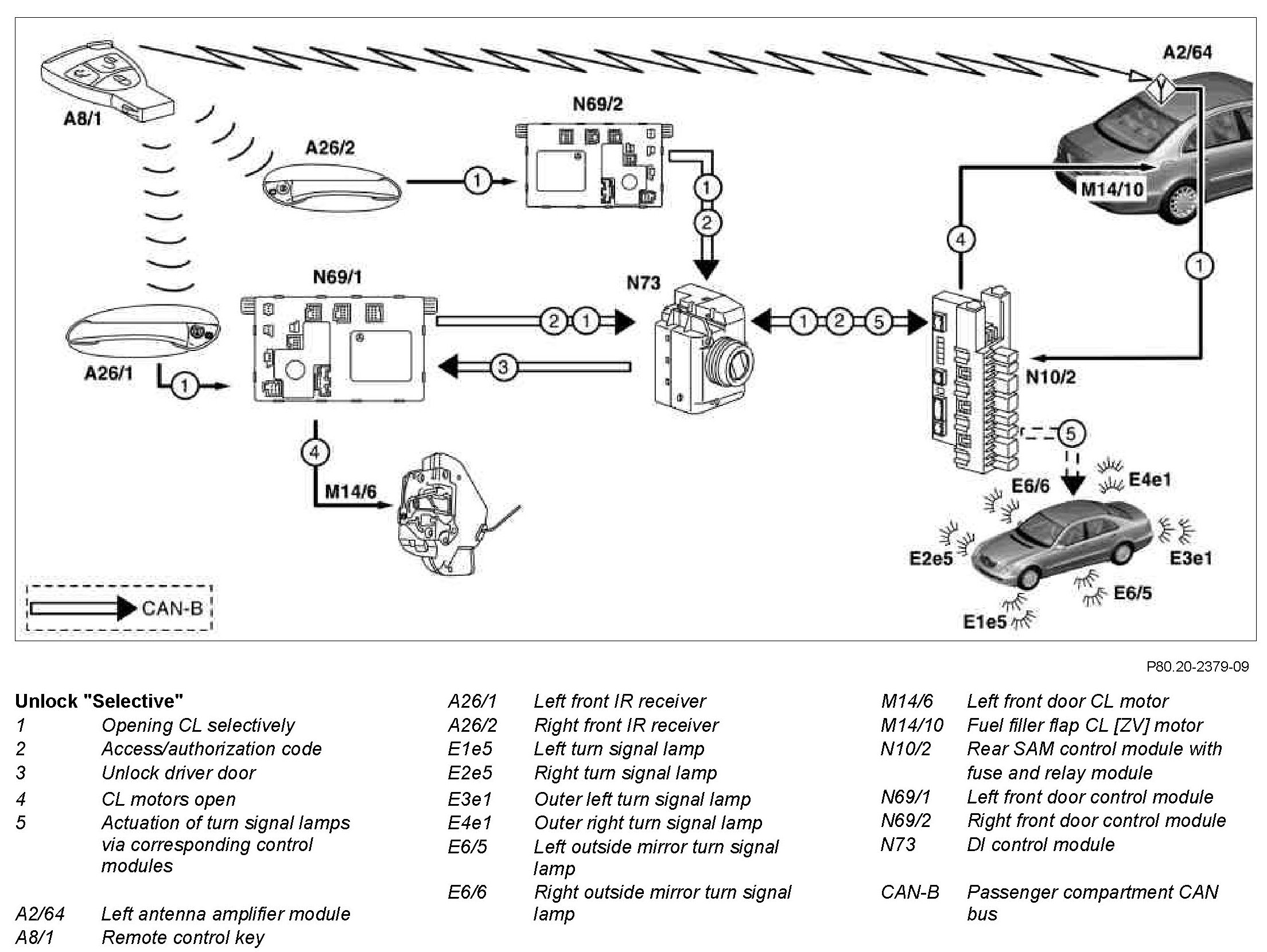When the button "Unlock vehicle" is actuated once, the remote control key (A8/1) transmits a signal to the corresponding receiver in the vehicle via radio and infrared signals. If the access authorization is valid, the EIS control module (N73) transmits the command for "global" to the left front door control module (N69/1), right front door control module (N69/2), left rear door control module (N69/3), right rear door control module (N69/4) and to the rear SAM control module with fuse and relay module (N10/2) via the passenger compartment CAN bus. These activate locking of the door locks, the fuel filler flap and the trunk lid.