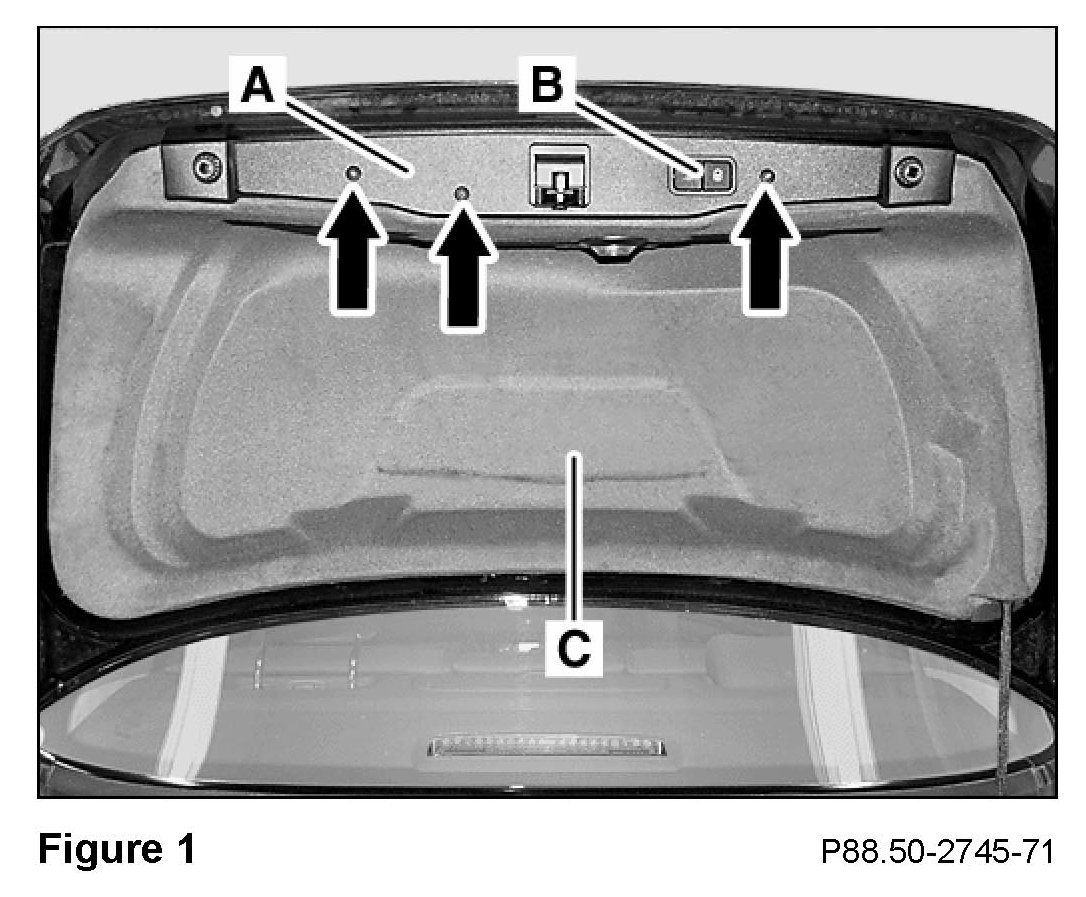 4. Remove the cover (A, Figure 1) on the bottom of the trunk lid by removing the three 4.2 mm sheet metal screws (Arrows, Figure 1).