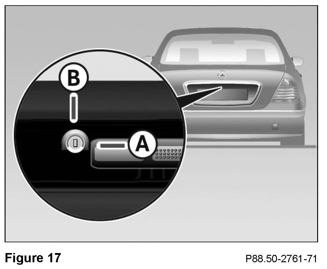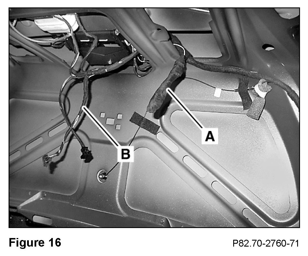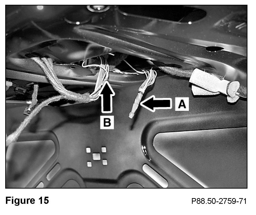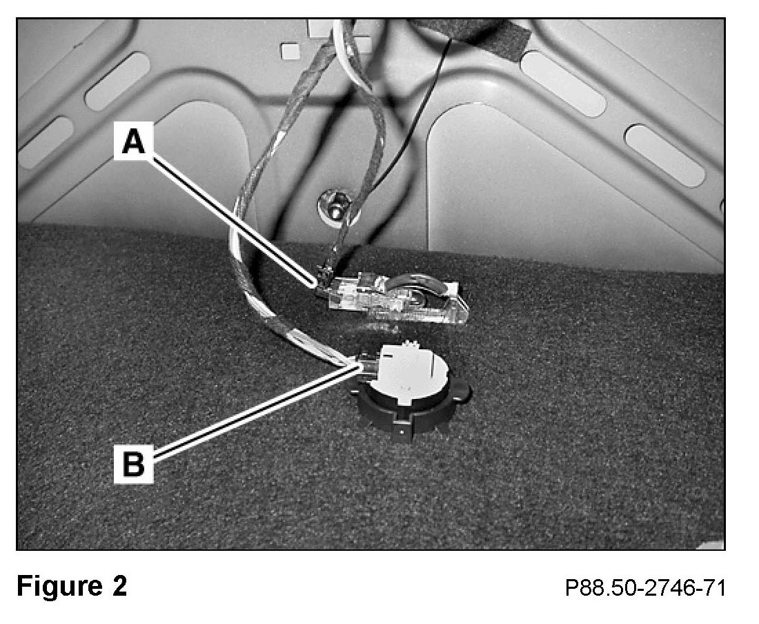 30. Reconnect the power supply connector (B, Figure 2) to the emergency release switch for the trunk lid in the trunk lid paneling.