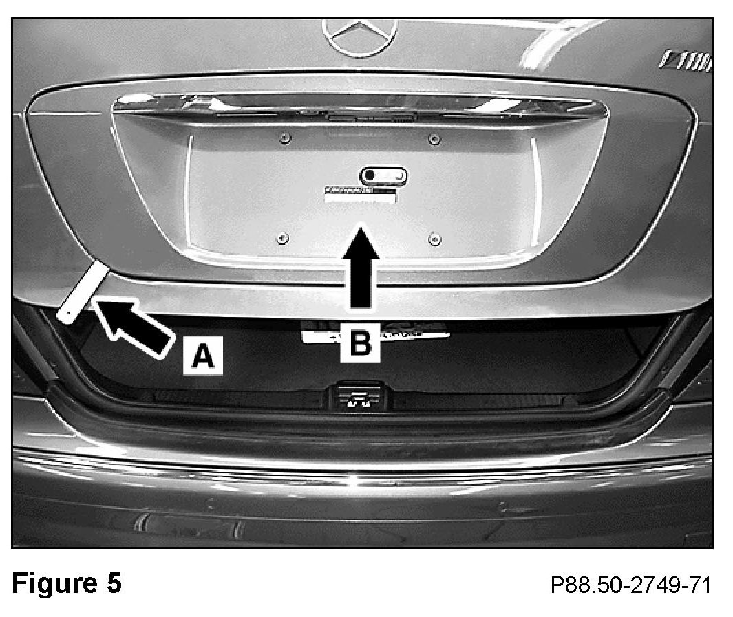 14. Use a plastic wedge (A, Figure 5) to carefully pry up and remove the license plate panel (B, Figure 5) on the trunk lid exterior.