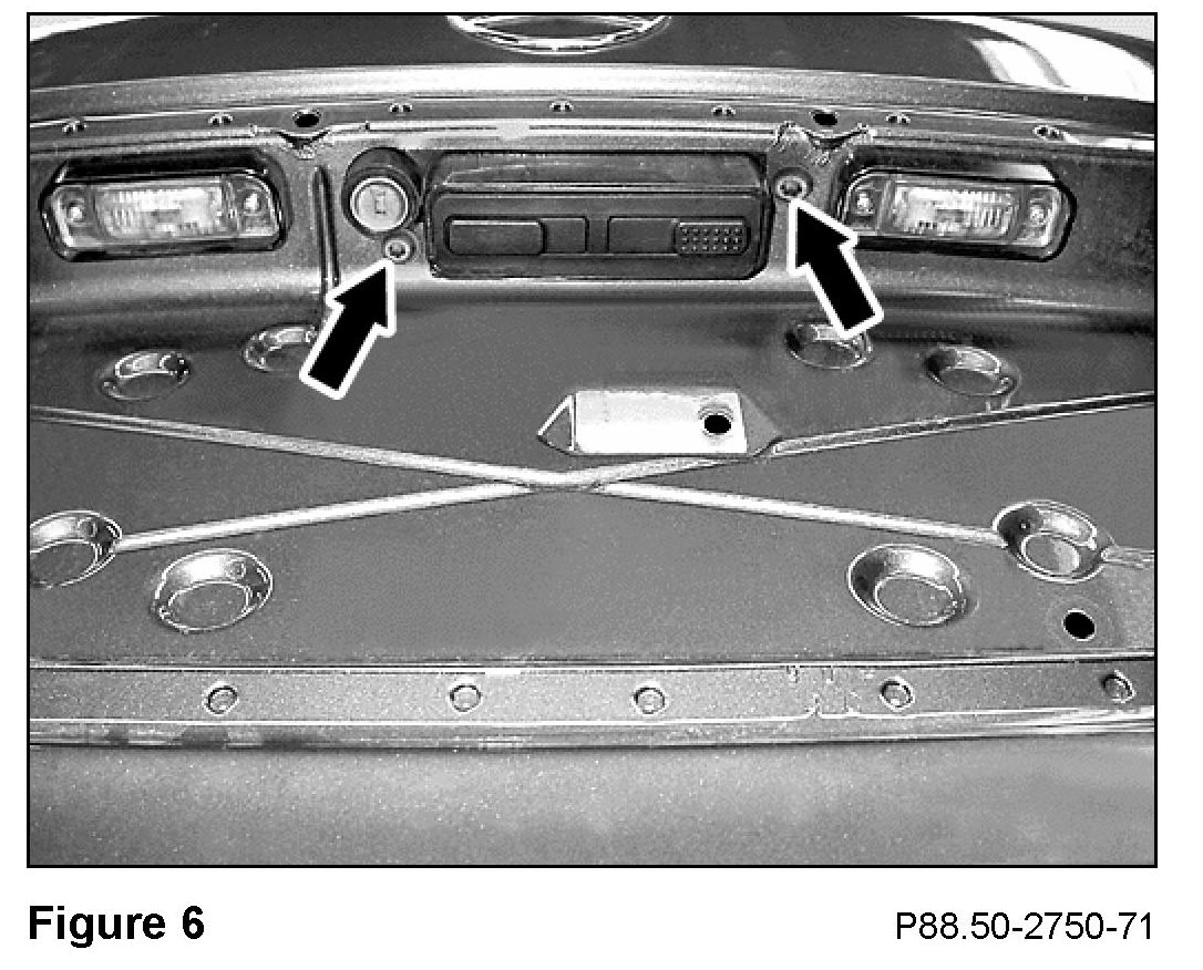 11. Reinstall the trunk lid lock with the two M6 screws (Figure 6) on the trunk lid exterior and the retaining bracket with the three M6 screws (Arrows, Figure 3) on the trunk lid interior.