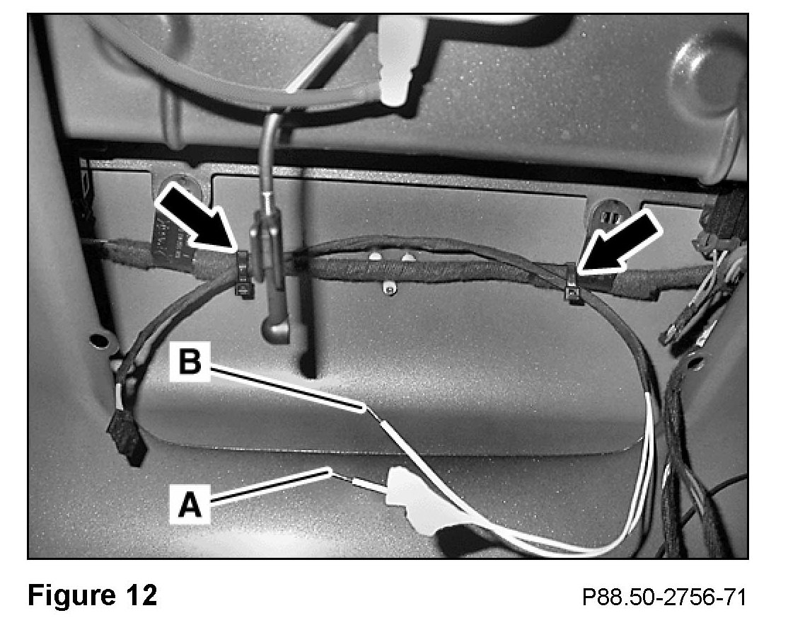 10. Secure with two wire ties (Arrows, Figure 12) the newly-made wiring harness to the wiring harness running along the trunk lid area exposed by the removed trunk lid lock.