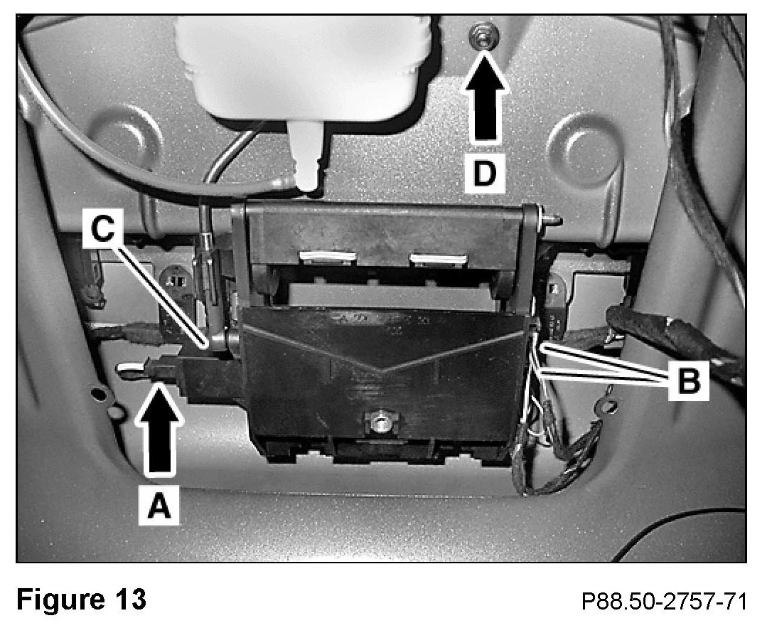 12. Connect the newly-made wiring harness (C, Figure 11) to the trunk lid lock (A, Figure 13).