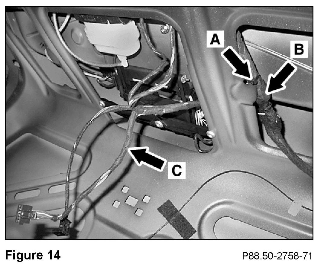 23. Unravel the tape (C, Figure 14) from the wiring harness for the emergency release switch for the trunk lid.