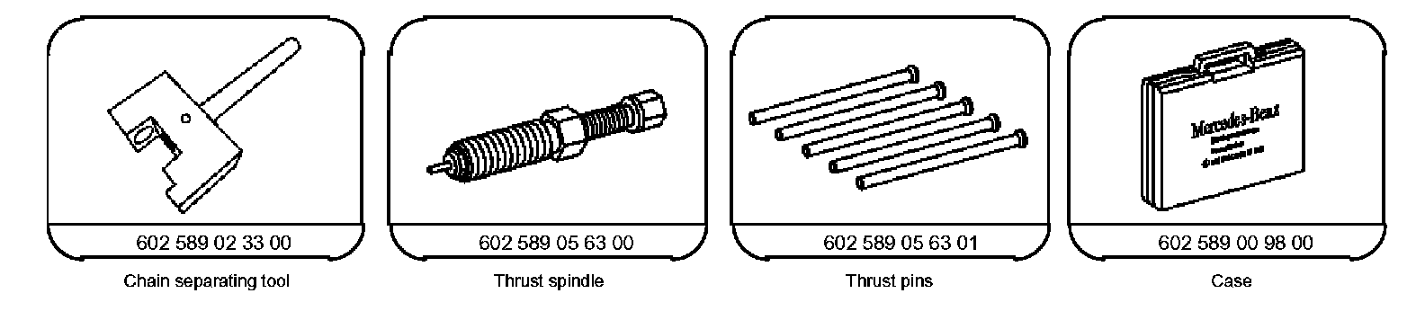 1 Assemble chain separating tool (1) and thrust spindle (2).