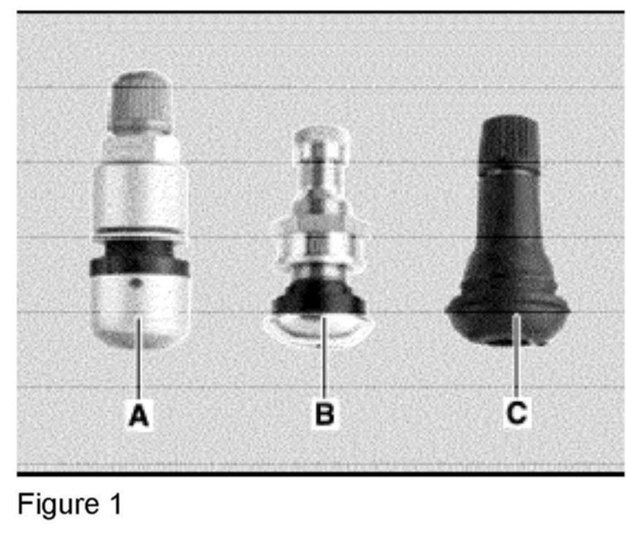 For mounting the wheel sensors Mercedes-Benz uses a tire inflation valve made from aluminum (A) in place of a steel valve (B) or rubber valve (C). (Figure 1)