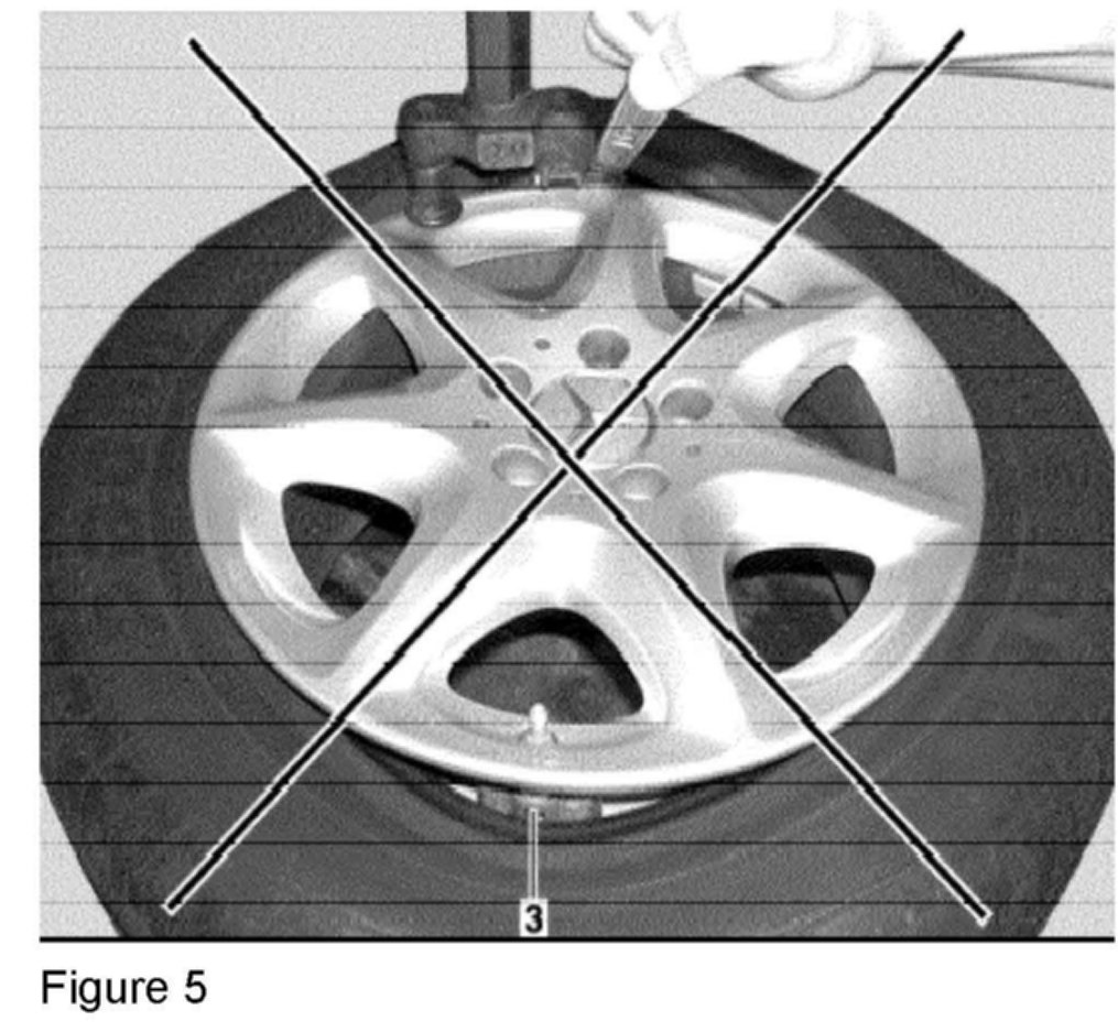 Possible causes for wheel sensor damage when disassembling tires When disassembling the tire, the assembly head of the tire mounting device and assembly lever must not be positioned in the valve area (1- Figure 4) and not on the inbound side as well.