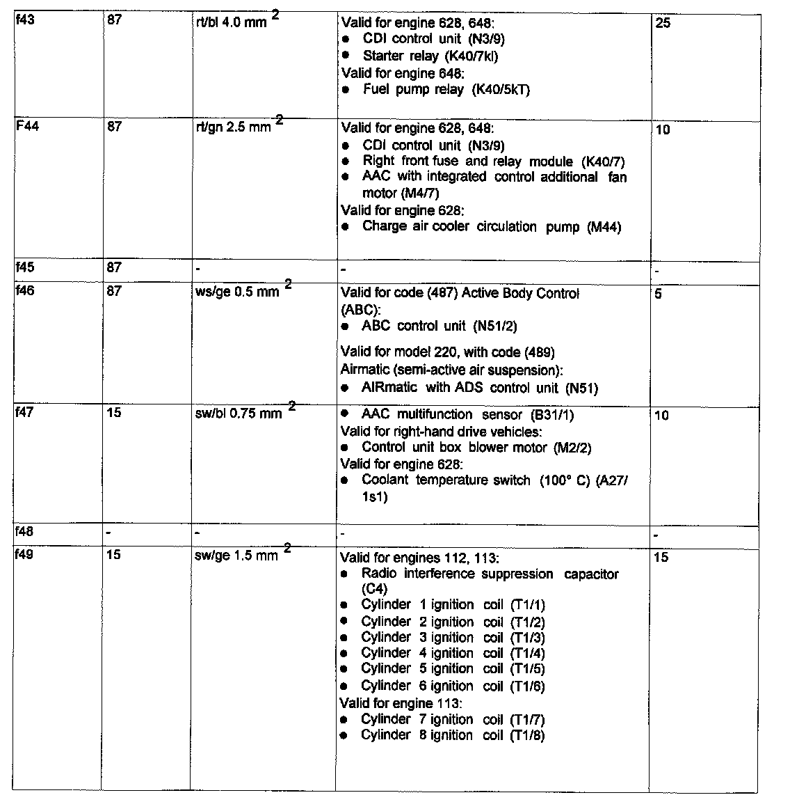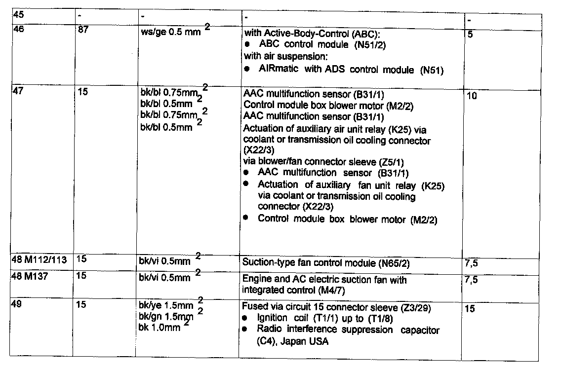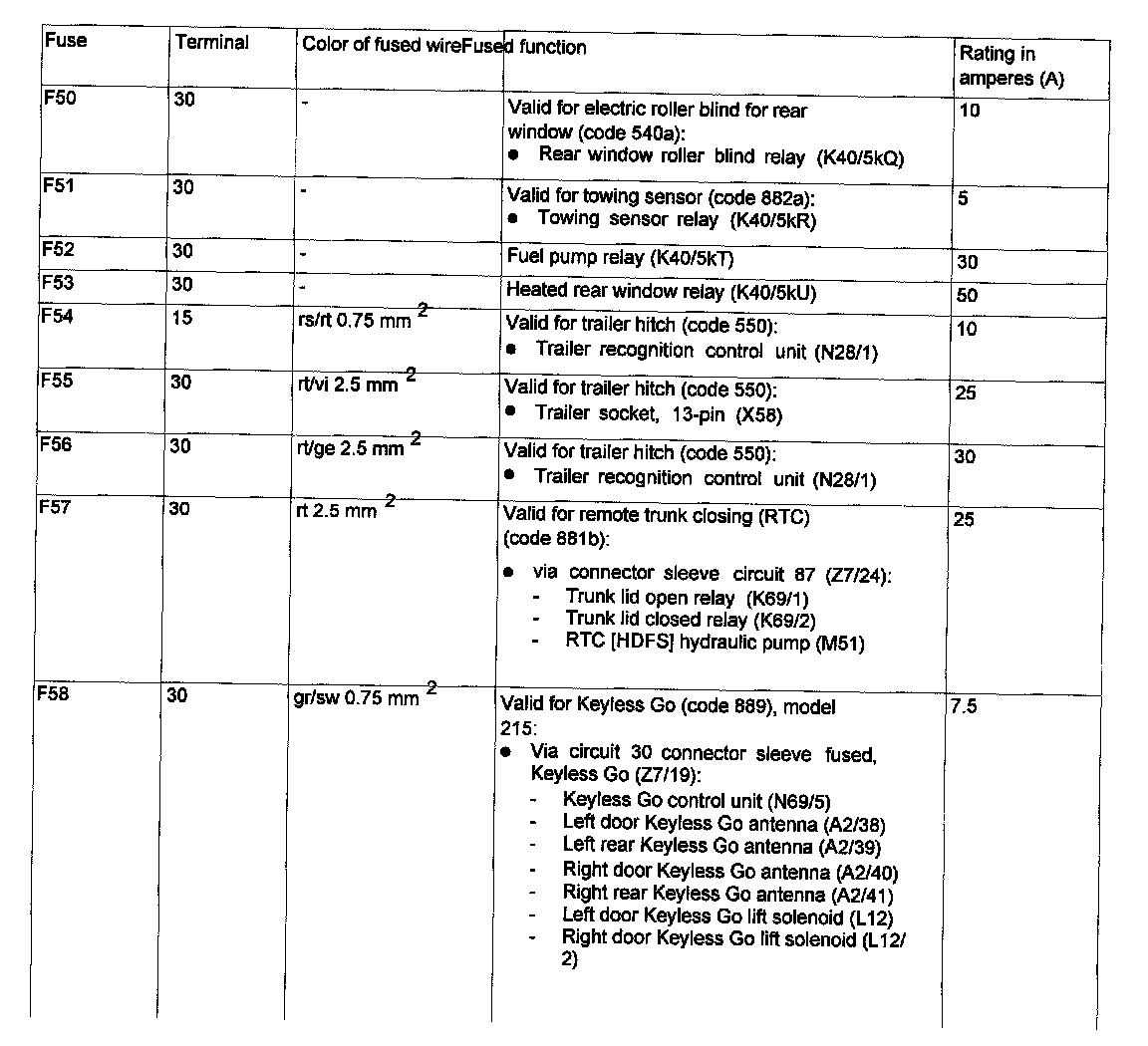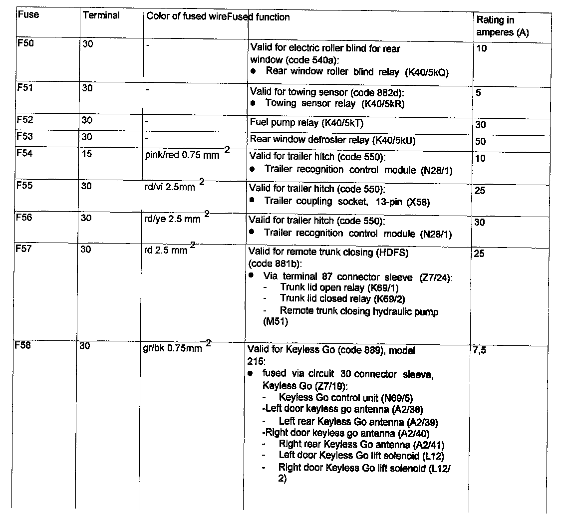 Assignment in the Fuse and Relay Box in the Right Engine Compartment