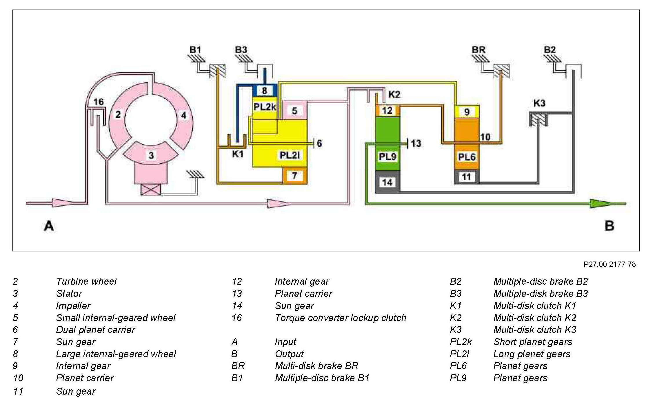 There is a connection between the sun gear (14) and sun gear (11) via the engaged multi-disk clutch K3 (K3). As a result sun gear (14) rotates at the same speed and direction of rotation as the sun gear (11) and drives the planet gears (PL9). The increased torque and reduced rotational speed as a result are transmitted via the planet carrier (13) to the transmission output shaft. The transmission output shaft therefore rotates in the direction of rotation of the engine at reduced rpm relative to the transmission input shaft.