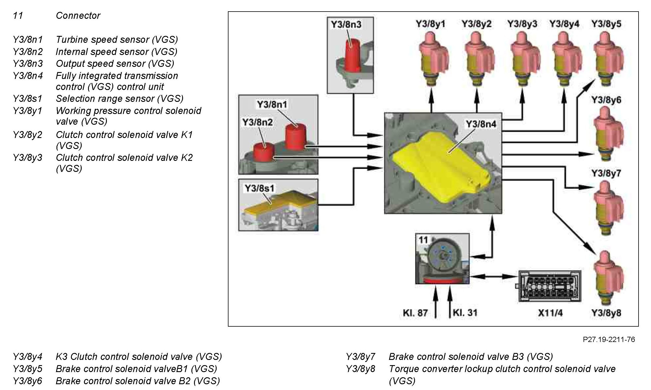 The control solenoid valves listed are actuated by the fully integrated transmission control (VGS) control unit (Y3/8n4) and trigger the hydraulic functions: