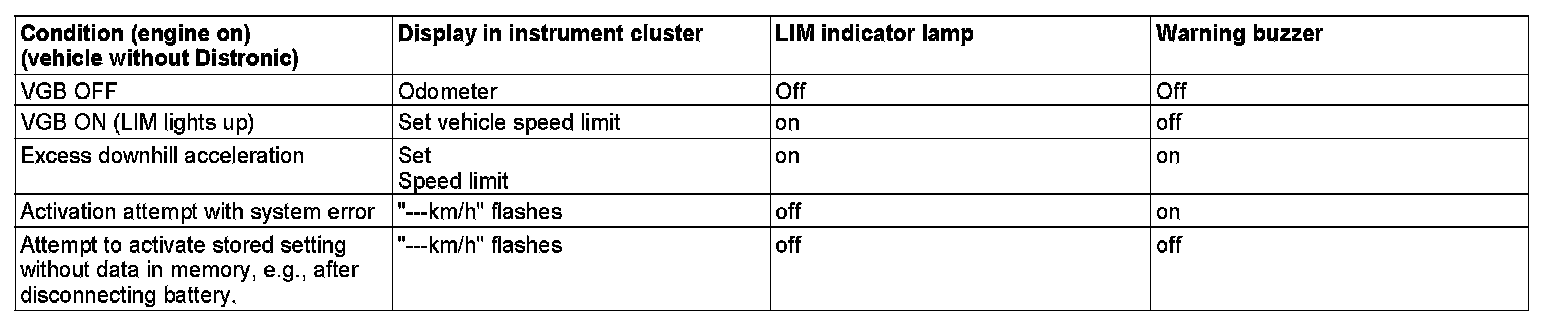 An additional function to the cruise control is the variable speed limiter (VGB) from 30 km/h (20 mph) right up to the maximum speed of the vehicle. The accelerator pedal must be actuated further. When the brakes are applied, the variable cruise control is not deactivated If the ignition is OFF, the memory setting of the variable speed limiter is retained.