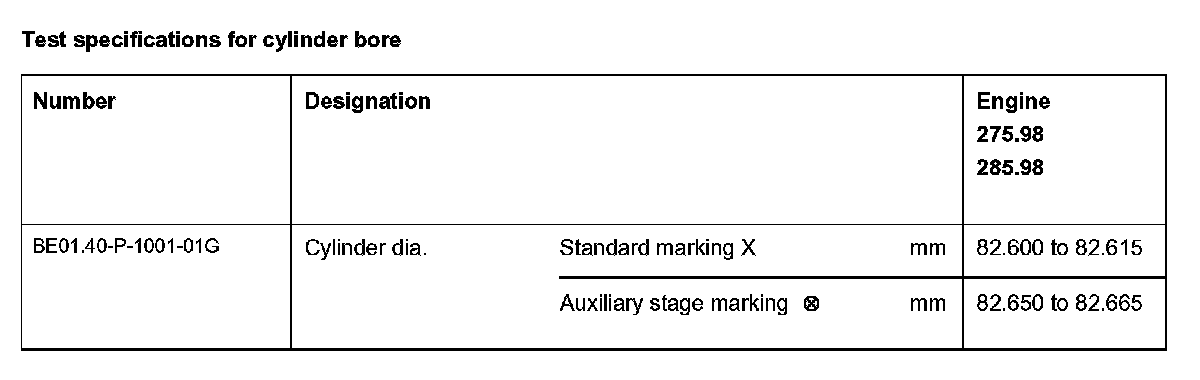 The cylinder bore diameter is specified in two tolerances. The two tolerances of the cylinder bore diameters are distinguished by the letters x and 0.