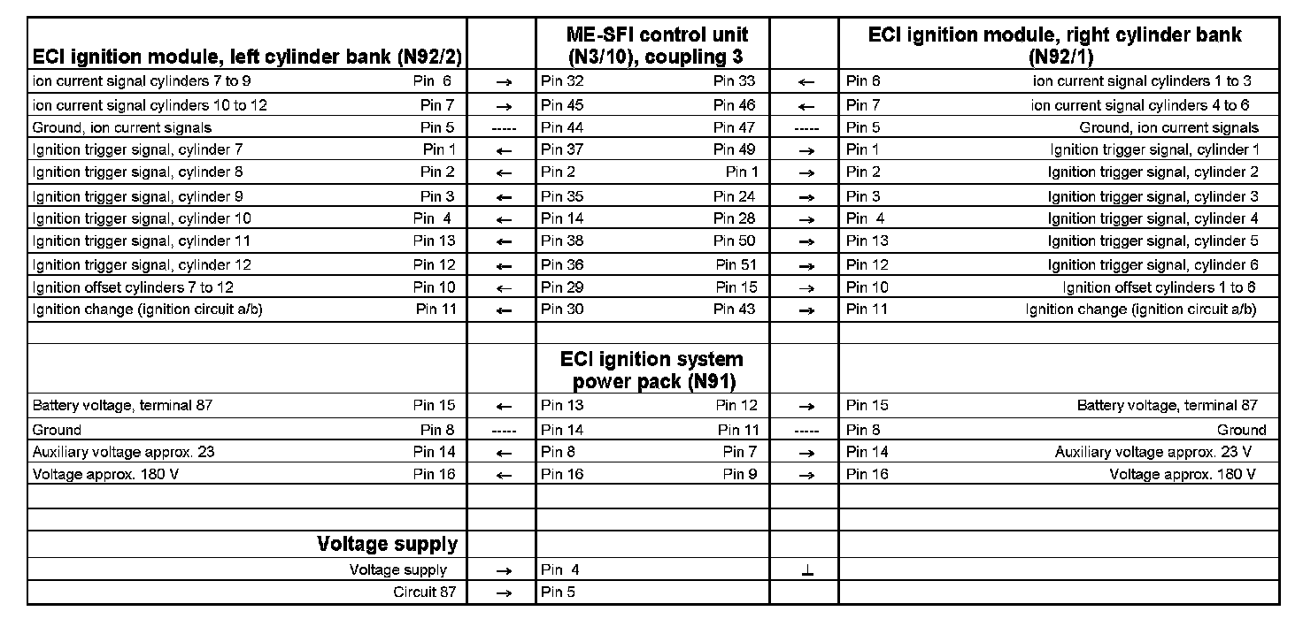 There is a switchover to ion current measurement at the end of the ignition spark phase and the ion current on the spark plug is measured with the help of an auxiliary voltage of about 23 V. Evaluation of the ion current signals takes place in the ME control unit. The signals are used for detection of combustion misfires at high rpms.