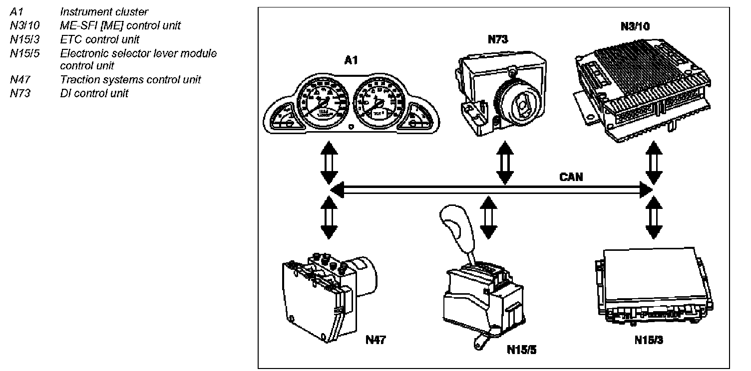 The electronic selector lever module control unit (N15/5) receives digital and analog input signals, actuates various components or transmits information to various control units via the Controller Area Network bus class C (engine compartment) (CAN-C). The selector lever positions and touch shifts carried out are detected in a non-contact manner by means of optoelectronic switches. A photoelectric barrier is closed or interrupted each time the position of the selector lever is changed.