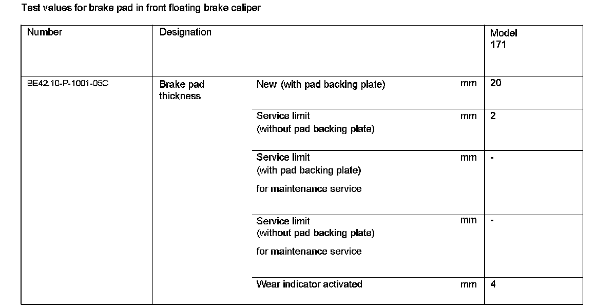 Test Values For Brake Pad In Front Floating Brake Caliper: