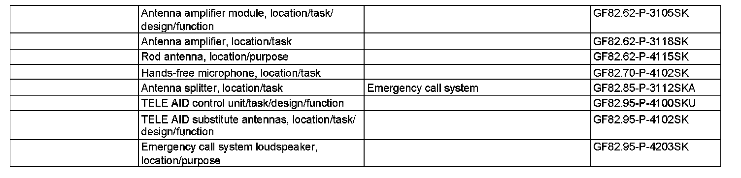 Usually, the telephone connections are processed via the rod antenna (A28). The left antenna amplifier module (A2/64) splits the signals of the rod antenna (A28) into signals for the central locking (CL), the radio component of the audio source that is installed in each case, and the Universal Portable CTEL Interface (UPCI) system. The portable CTEL antenna amplifier (A28/2) controls the signals of the rod antenna (A28). In normal mode, the signals of the rod antenna (A28) are transmitted to the Universal Portable CTEL Interface (UPCI [UHI]) control unit (N123/1) and vice versa. In emergency mode, the telephone signals of the rod antenna (A28) are forwarded to the emergency call system control unit (N123/4) and vice versa. In the event of a defective rod antenna (A28), e.g, after a rollover, the emergency call system left backup antenna (A2/54) and the emergency call system right backup antenna (A2/55) are integrated in the rear bumper of the vehicle.