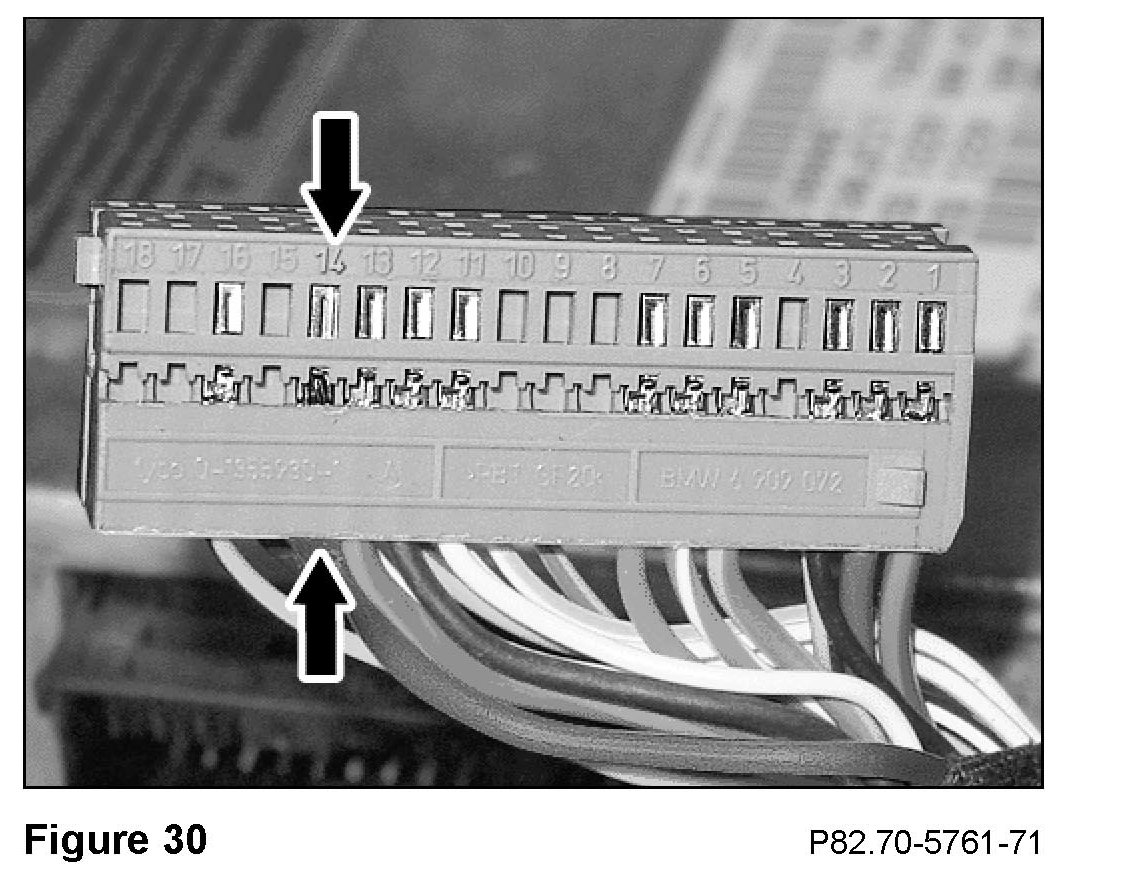 4. If pin # 14 is occupied (Arrows, Figure 30), verify that the violet-color wire coming from pin # 14 goes to: