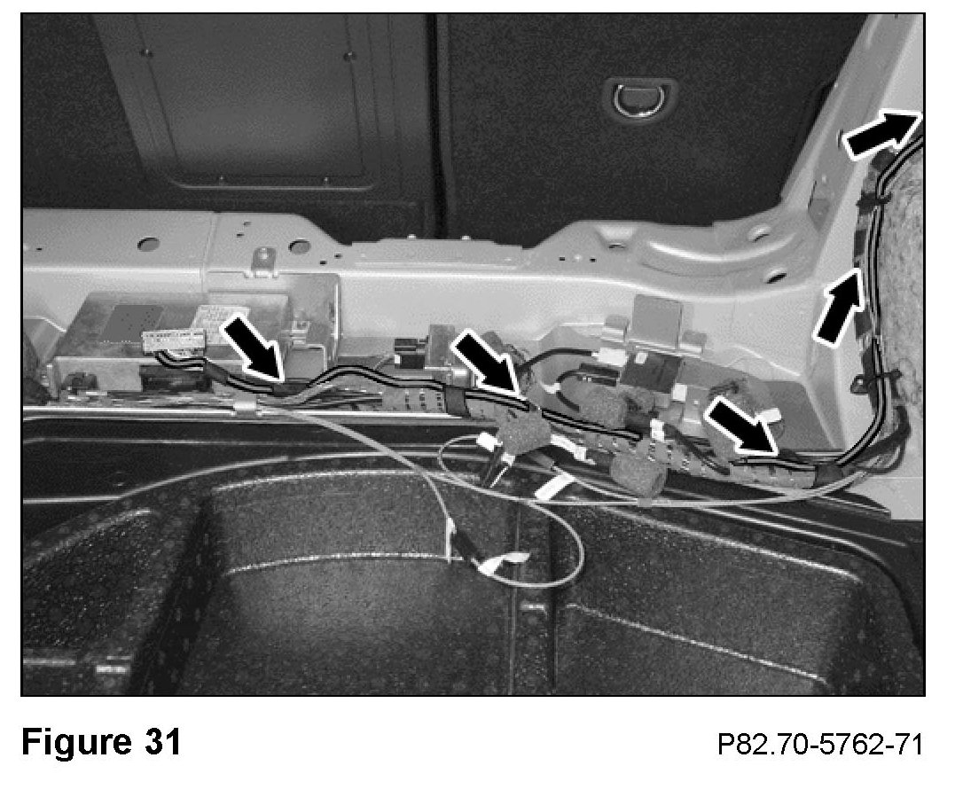9. Route the 20-gauge, violet-color wire along the main wiring harness from the power supply connector for the Tele Aid control module to the linear compensator (Figure 31).
