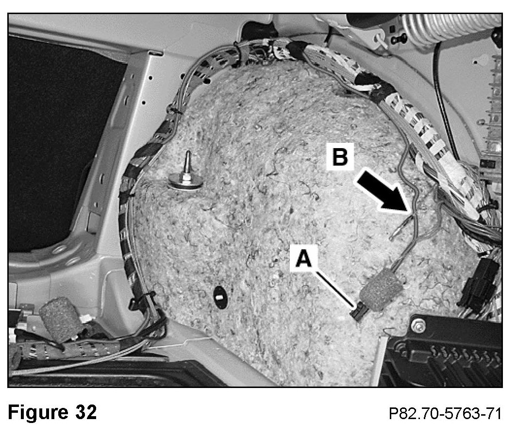 13. Cut the violet-color wire of the power supply wiring harness for the linear compensator halfway between the connector and the point where it branches off the main wiring harness (B, Figure 32).